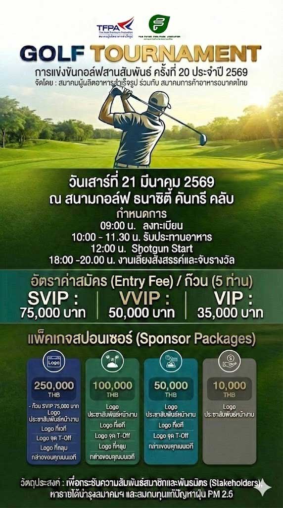 ขอเรียนเชิญเข้าร่วมแข่งขันหรือสนับสนุนการจัดงานกอล์ฟสานสัมพันธ์ ครั้งที่ 20 Posted at 06/02/2026 in Golf, Our Activities by admin สมาคมผู้ผลิตอาหารสำเร็จรูปและสมาคมการค้าอาหารอนาคตไทย ขอเรียนเชิญเข้าร่วมแข่งขันหรือสนับสนุนการจัดงานกอล์ฟสานสัมพันธ์ ครั้งที่ 20 ในวันเสาร์ ที่ 21 มีนาคม 2569 ณ สนามกอล์ฟธนาซิตี้ คันทรีคลับ ถ.บางนา-ตราด กม.14Map : https://maps.app.goo.gl/RkoC2rHUSSbS1FYr5 – 09.00 น. ลงทะเบียน– 10.00 น. รับประทานอาหาร– 12.00 น. Shotgun Start– 18.00 – 20.00 น. งานเลี้ยงสังสรรค์และมอบรางวัล รูปแบบการสนับสนุน 1. ทีม SVIP 75,000 บาท2. ทีม VVIP 50,000 บาท3. ทีม VIP 35,000 บาท4. Sponsor 250,000 บาท5. Sponsor 100,000 บาท6. Sponsor 50,000 บาท7. Sponsor 10,000 บาท สมัครภายในวันที่ 6 มีนาคม 2569ท่านที่สนใจสามารถส่งแบบตอบรับกลับมาที่E-mail account@thaifood.org สอบถามข้อมูลเพิ่มเติมได้ที่ คุณนัทนิชาโทร 02-261-2684 ต่อ 21, 096-654-1796เอกสารประกอบการสมัครhttps://drive.google.com/drive/folders/1bOD4vmbDoYKcsWwWY0JLji5KeHzlxwmw?usp=sharing